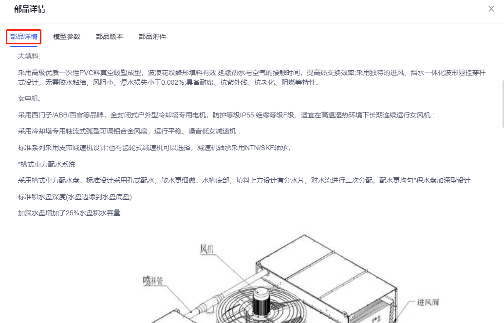点击“部品”,进入部品详情页面。查看该部品详情,包含部品详情、模型参数、部品版本、部品附件、轻量化模型、编辑。