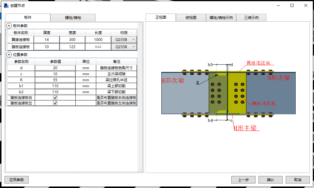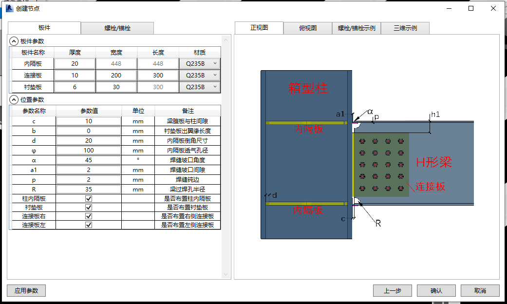 第五步:选择需要创建的梁柱类型(双击节点图标或单击后下一步)进入节点编辑界面。编辑板件、抗剪键以及板件的位置参数,编辑锚栓、板件的布置参数